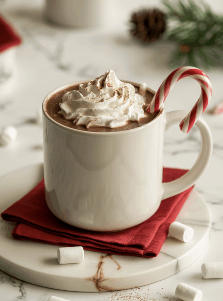 Warm milk in a saucepan, then whisk in protein powder, cocoa, and cinnamon until smooth. Pour into a mug, top with zero-sugar whipped cream, and dust lightly with cocoa powder.