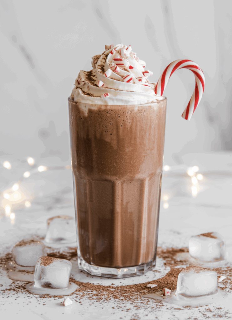 Blend all ingredients until smooth. Pour into a tall glass and top with crushed candy cane pieces.
