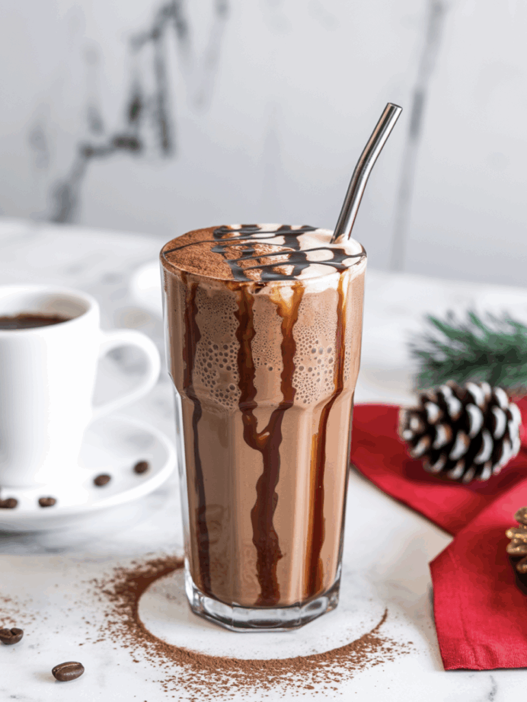Blend everything until smooth and frothy. Serve with a sprinkle of cocoa powder and a straw.