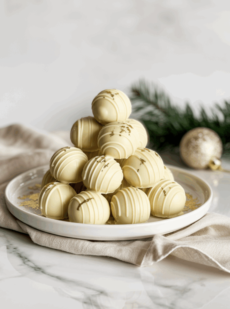 Mix everything together and roll into balls. Chill in the fridge, then drizzle with melted white chocolate before serving.