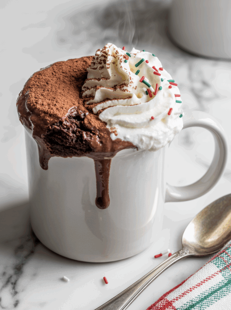 Whisk everything in a microwave-safe mug until smooth. Microwave for 60–70 seconds. Top with sugar-free whipped cream and festive sprinkles.