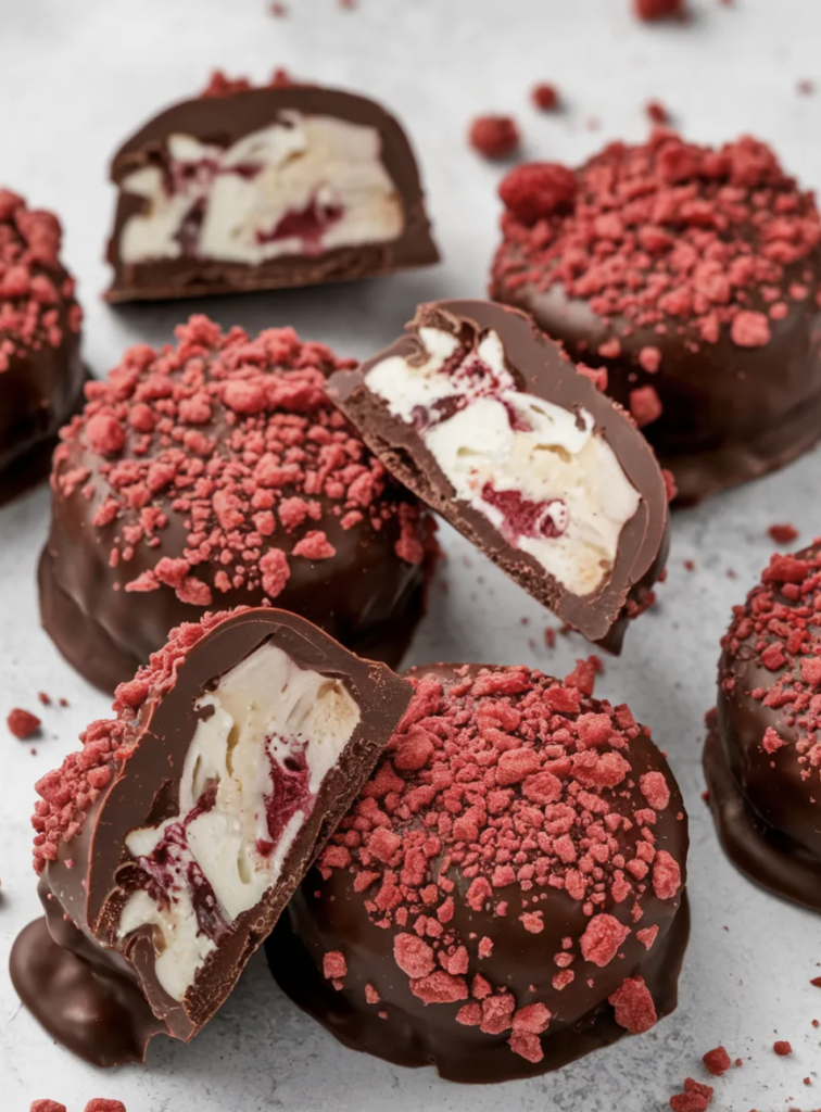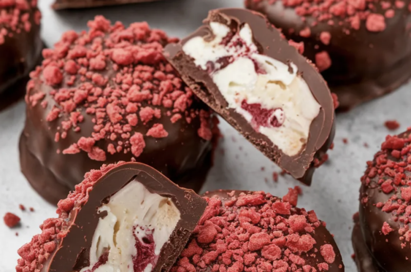 - Working quickly, dip each frozen yogurt bite into the melted chocolate, letting excess drip off, then place it back onto the parchment-lined tray and immediately sprinkle with extra crushed freeze-dried raspberries if desired.