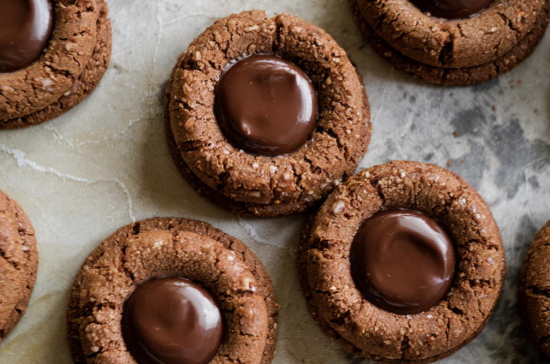 - Bake the cookies in a preheated oven at 180°C / 350°F for 10–12 minutes until set around the edges but still soft in the center, then remove from the oven and gently re-press the centers while they’re warm if needed to keep the wells defined.