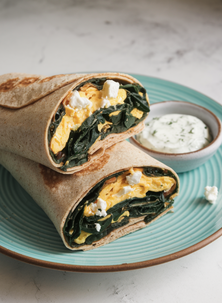 Place eggs in the tortilla, top with feta, and wrap tightly.
