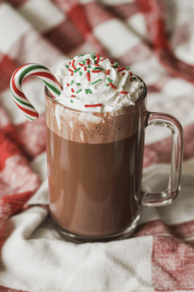 - Remove from heat and stir in the vanilla extract. Pour the hot chocolate into two large mugs. Top generously with whipped cream, add festive red and green sprinkles, and hang a candy cane over the edge of each mug. Serve immediately while it’s warm and cozy.