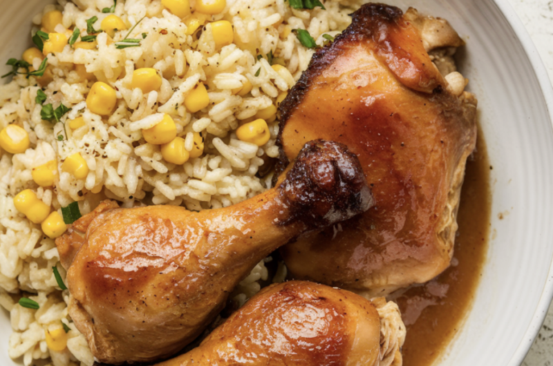- While the chicken finishes cooking, prepare the rice by cooking it in chicken stock or well-seasoned water until fluffy, then gently fold in sweet corn and a pinch of salt while it’s still warm so the kernels soften slightly and release their sweetness into the rice. Finish with chopped fresh herbs and a small drizzle of butter or oil to give the rice a glossy, comforting texture.