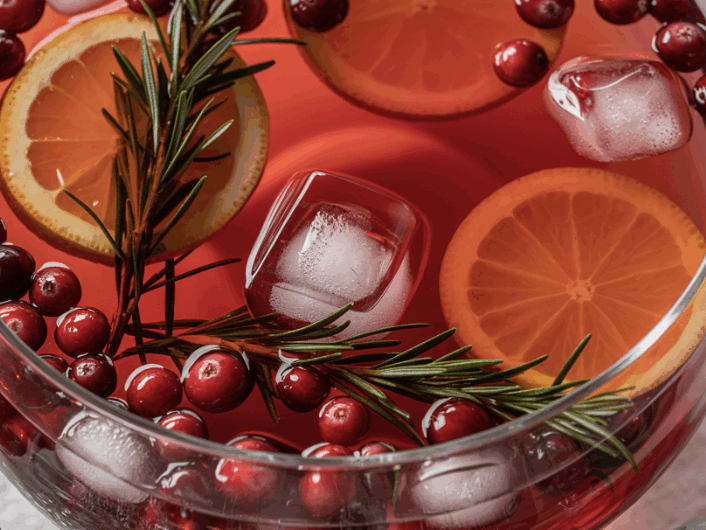 - Gently stir in the fresh cranberries and drop the orange slices around the bowl so they float to the top like ornaments. Finish by adding sprigs of rosemary for that instant Christmas aroma, and serve immediately in chilled glasses.