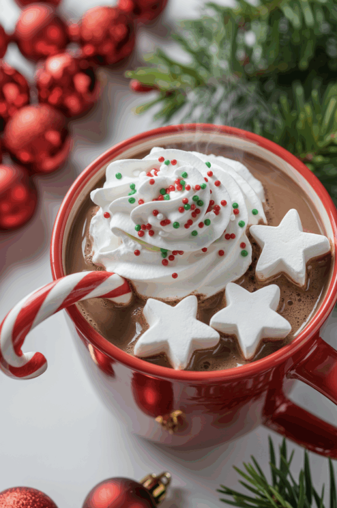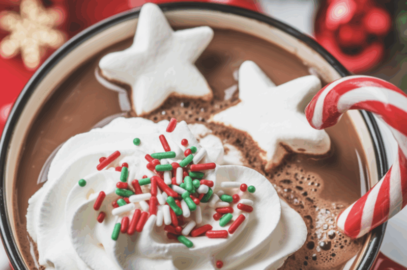 This vegan version is rich, creamy, and festive, topped with dairy-free whipped cream, sprinkles, and holiday-shaped marshmallows to make it extra magical.
